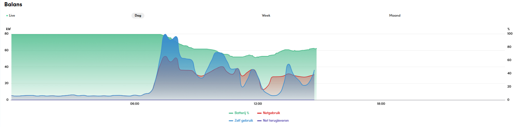 De batterij wordt niet alleen geladen door de zonnepanelen, maar ook slim aangestuurd op basis van het netverbruik. Op rustige momenten, wanneer de vraag lager is, wordt de batterij geladen vanuit het net. Op het moment dat er meer vermogen nodig is dan het net kan leveren, levert de batterij automatisch bij. Zo blijft de bedrijfsvoering ononderbroken en het energieverbruik stabiel.